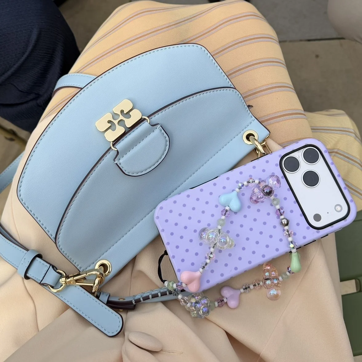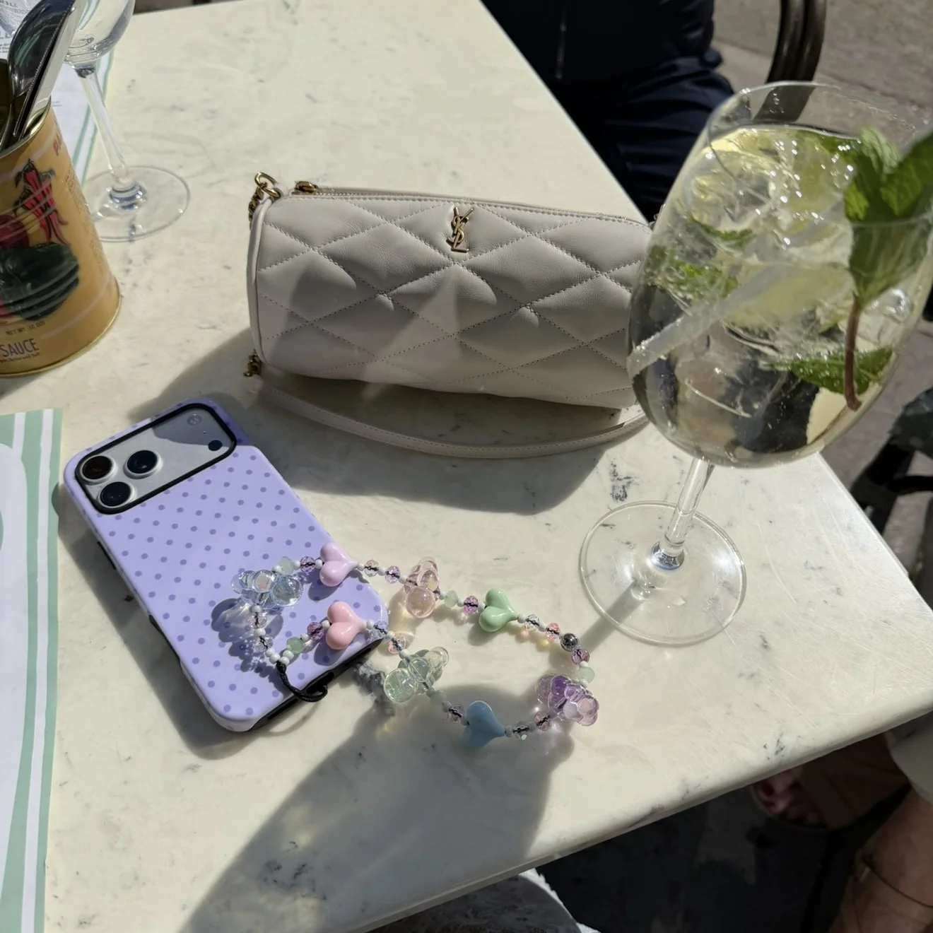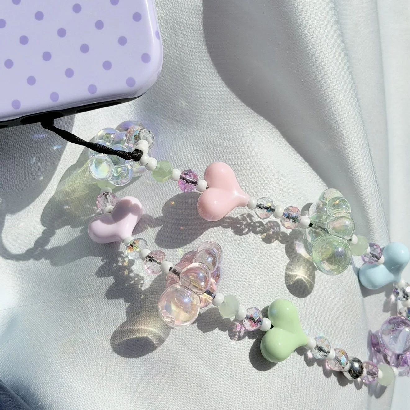Add a soft touch of charm to your phone with this pastel-toned accessory. Featuring gentle hues of blush pink, lavender, baby blue, mint, heart beads paired with dreamy iridescent clouds, each bead is spaced with coordinating glass round beads separated by delicate white seed beads which accentuate each shade.